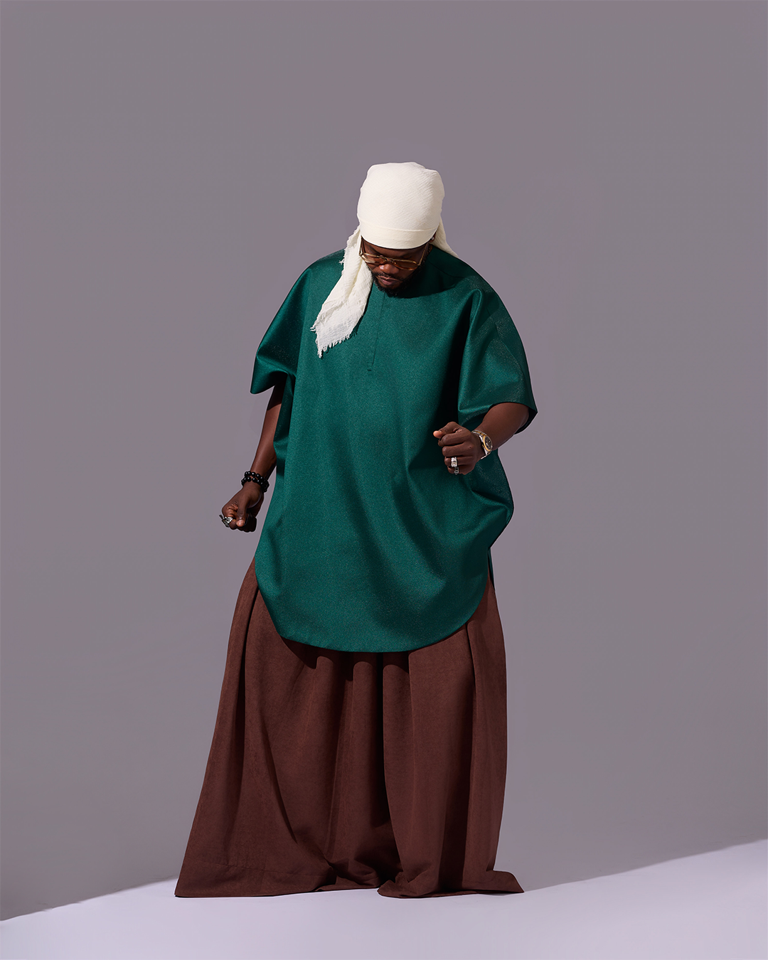 The ensemble features a dramatic, oversized tunic with an architectural, inverted U-shaped hemline that creates a powerful and flowing silhouette. Crafted from richly textured fabric, it moves with the quiet confidence of a leader. Paired with voluminous, wide-leg skirt-trousers, the look is both grounded and majestic.