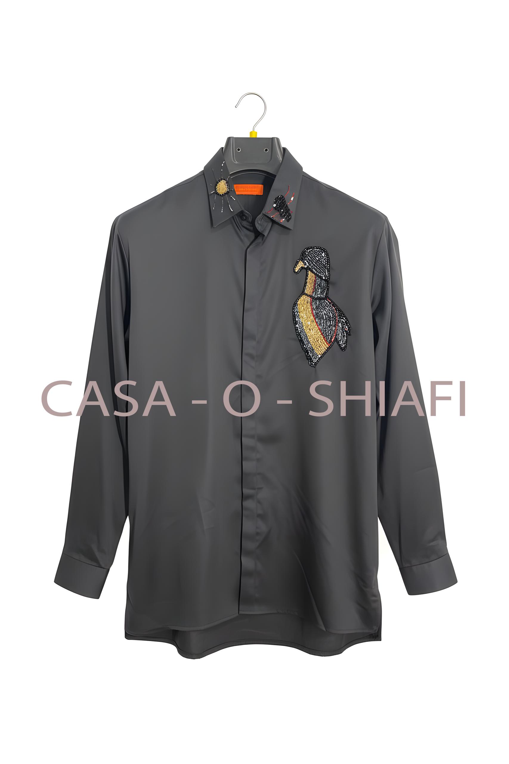 Crafted with precision, the shirt features a striking handmade embroidered quetzal motif, carefully detailed to reflect the elegance and rarity of the bird. Each stitch is meticulously placed by hand, transforming the garment into a wearable piece of art that blends culture, craftsmanship, and contemporary luxury.