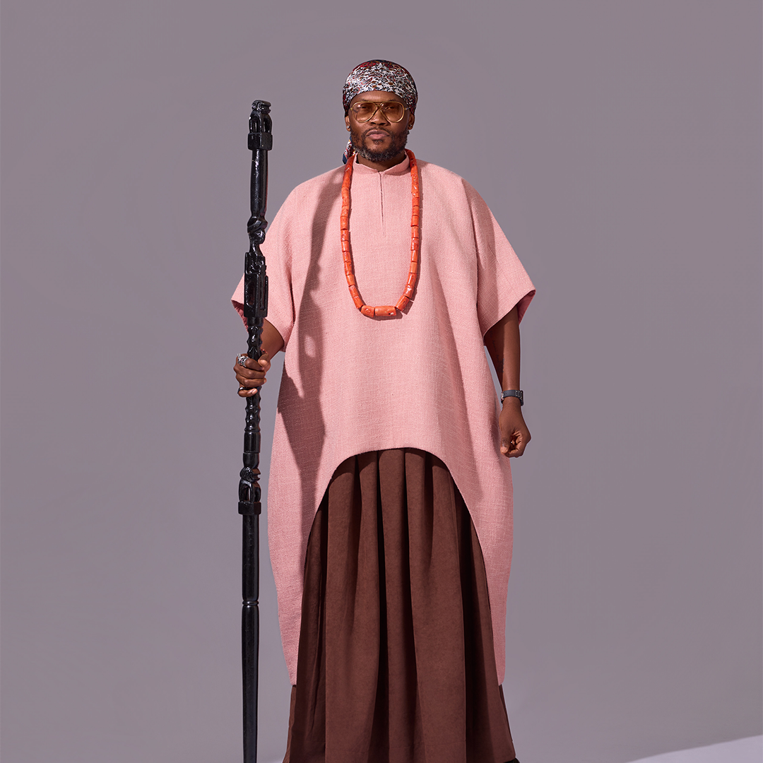 This striking two-piece set features an extraordinary tunic in a sophisticated, muted rose pink, crafted from a textured, breathable fabric. Its unique silhouette boasts an inverted U-shaped hemline that dramatically drapes over the hips, flowing into wide, elbow-length sleeves and a minimalist round neckline. This distinctive top is paired with a matching wide-leg skirt-trouser (often called a “buba” or “sokoto” in some cultural contexts), in a rich, earthy brown that provides a grounding contrast and elegant movement.