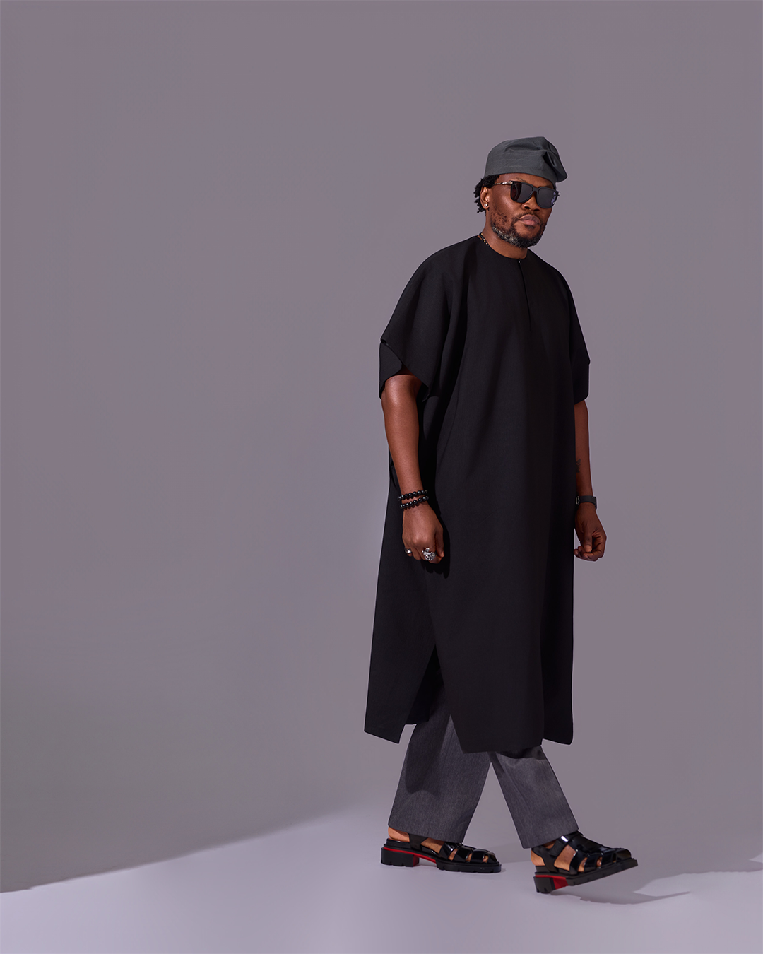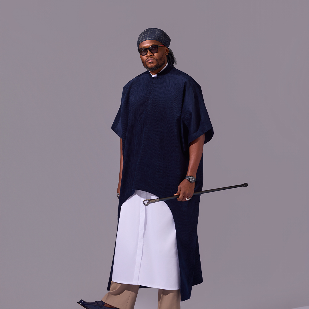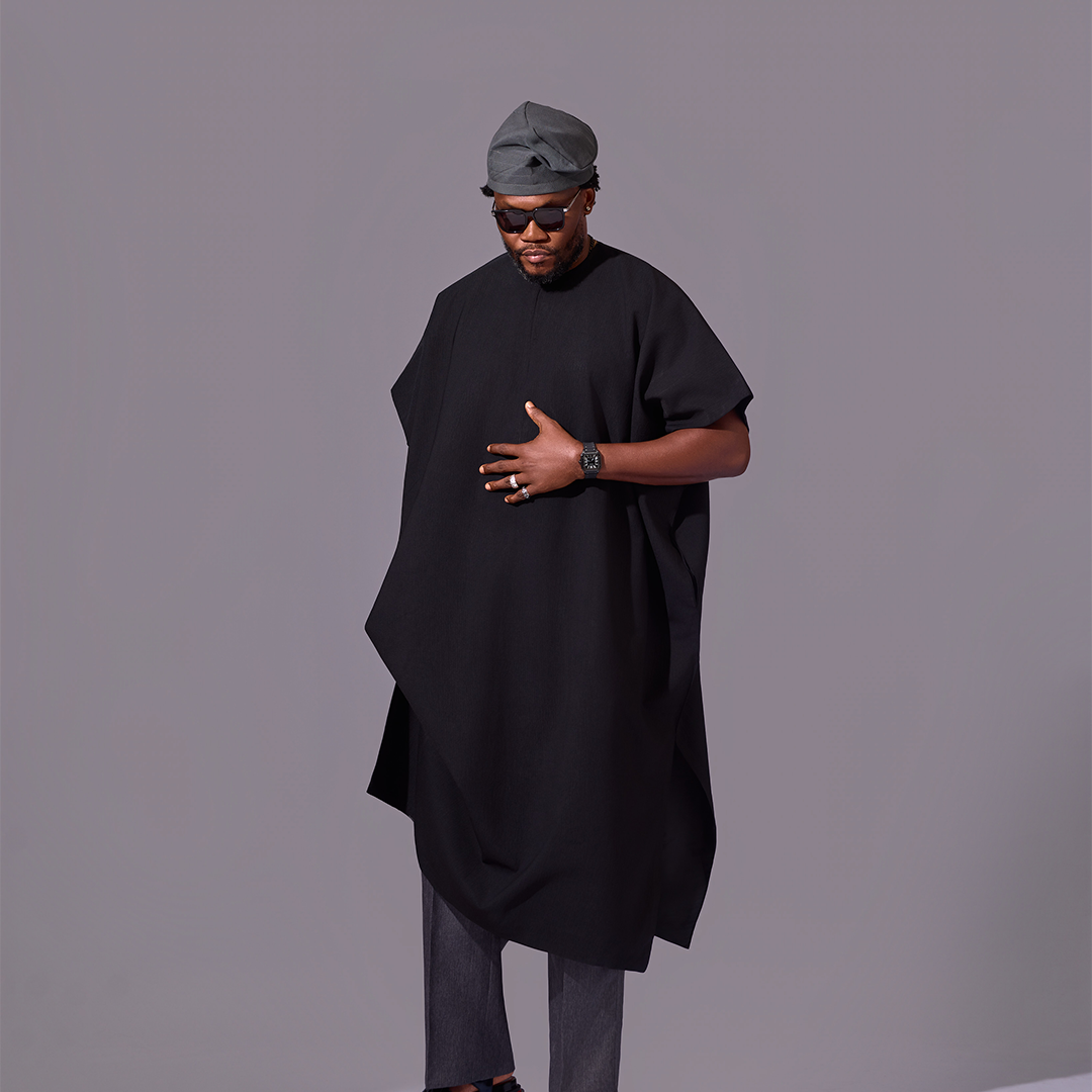 This outfit is a tribute to the kind of grace and strength that comes from a deep connection to one’s roots. The oversized black top is cut from a unique textured fabric and features a dramatic, clean-cut asymmetrical hemline, creating a powerful and memorable silhouette.