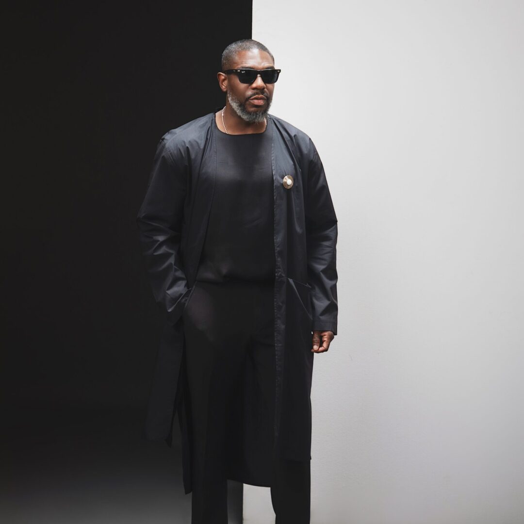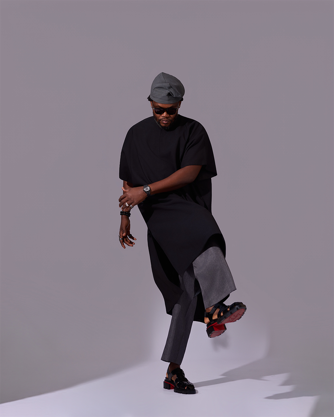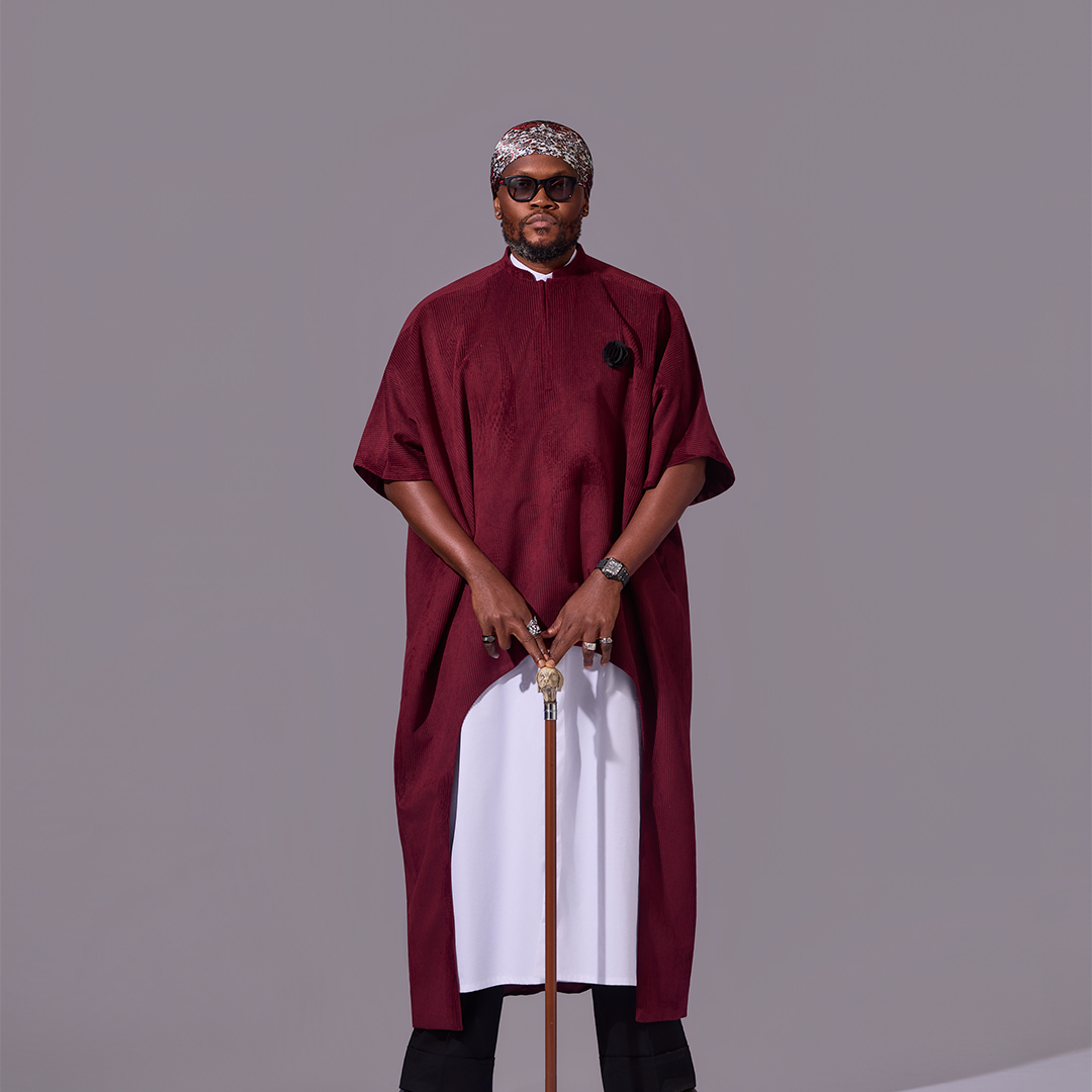 This outfit is a tribute to the kind of grace and strength that comes from a deep connection to one’s roots. The oversized black top is cut from a unique textured fabric and features a dramatic, clean-cut asymmetrical hemline, creating a powerful and memorable silhouette.