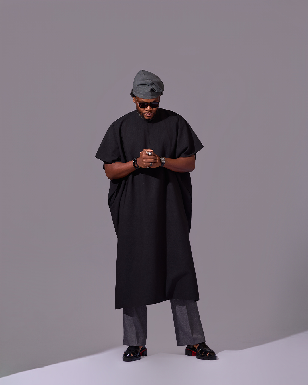 This outfit is a tribute to the kind of grace and strength that comes from a deep connection to one’s roots. The oversized black top is cut from a unique textured fabric and features a dramatic, clean-cut asymmetrical hemline, creating a powerful and memorable silhouette. It is paired with perfectly tailored charcoal grey trousers that complete the sharp, distinguished look.