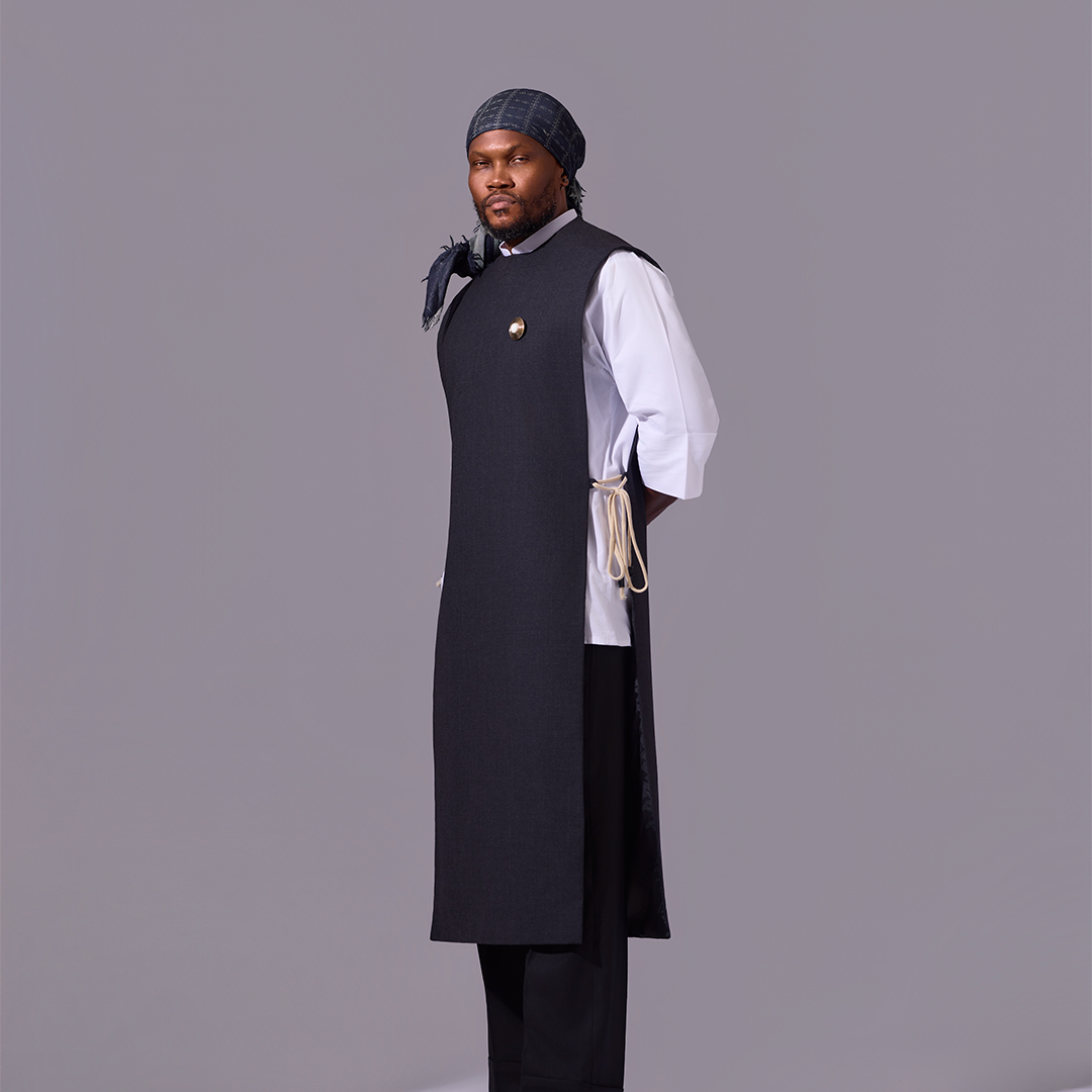 This two-piece set is a masterclass in modern tailoring. The commanding, oversized tunic is crafted from a rich, textured navy fabric, featuring a flowing, asymmetrical hemline and wide sleeves that convey relaxed authority. The tunic’s high-neck, clerical-style collar adds a touch of scholarly discipline.